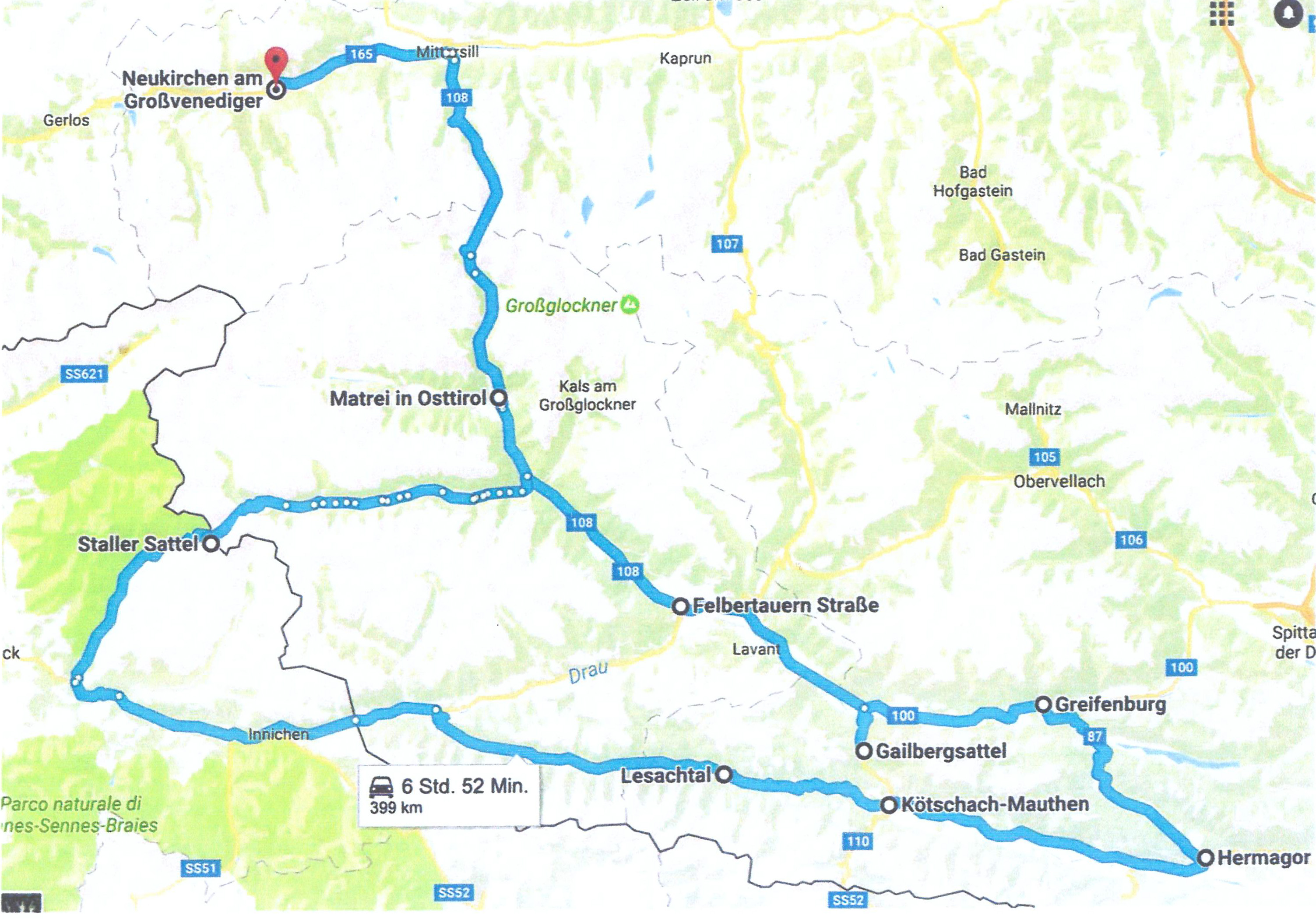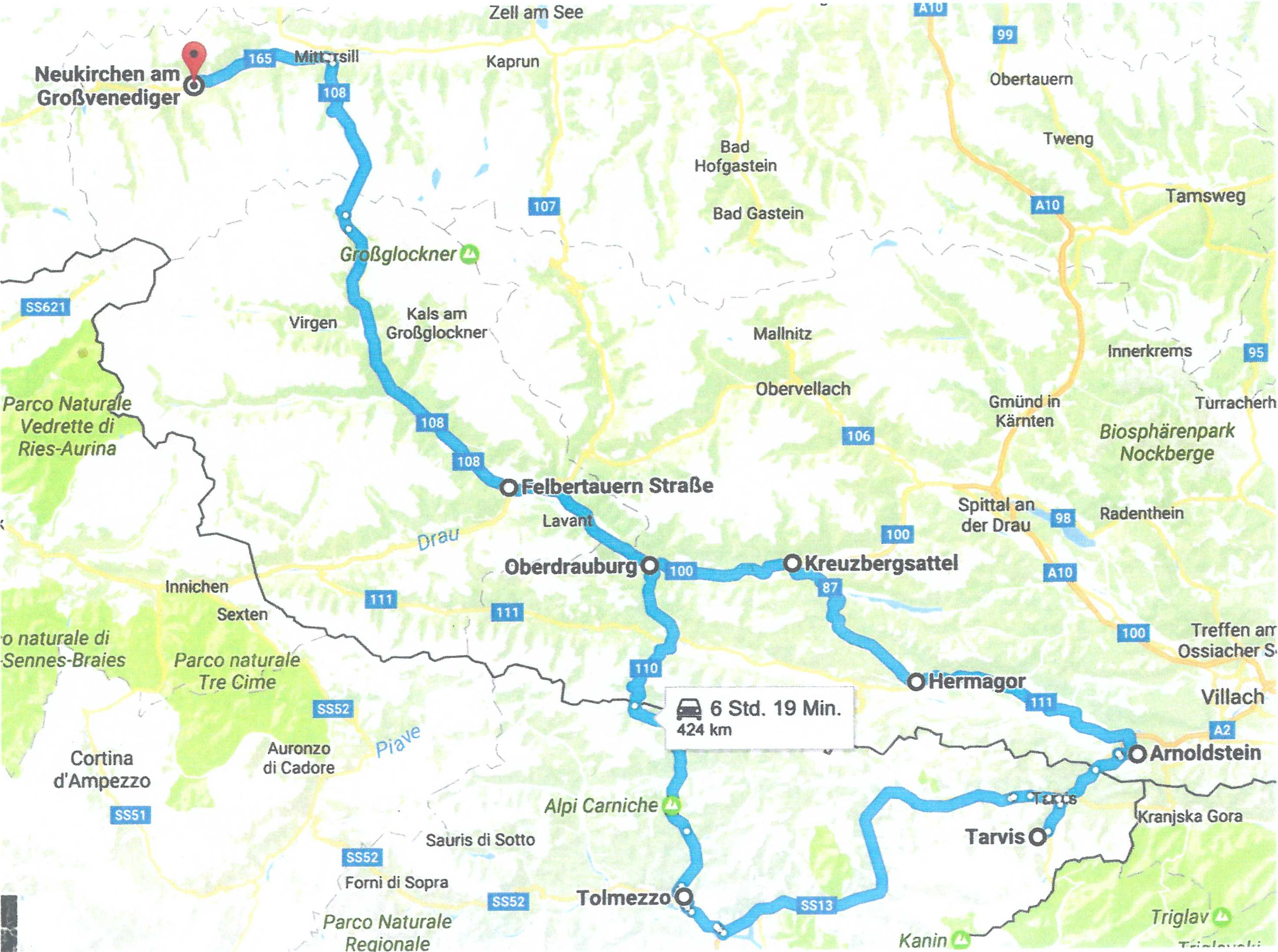 - Neukirchen – Mittersill – Felbertauern – Plöckenpass – Tolmezzo – Tarvis – Arnoldstein – Hermagor – Kreuzbergsattel – Oberdrauburg – Felbertauern – Neukirchen 424 km, Fahrtzeit ca. 6 Std. 20 Min.