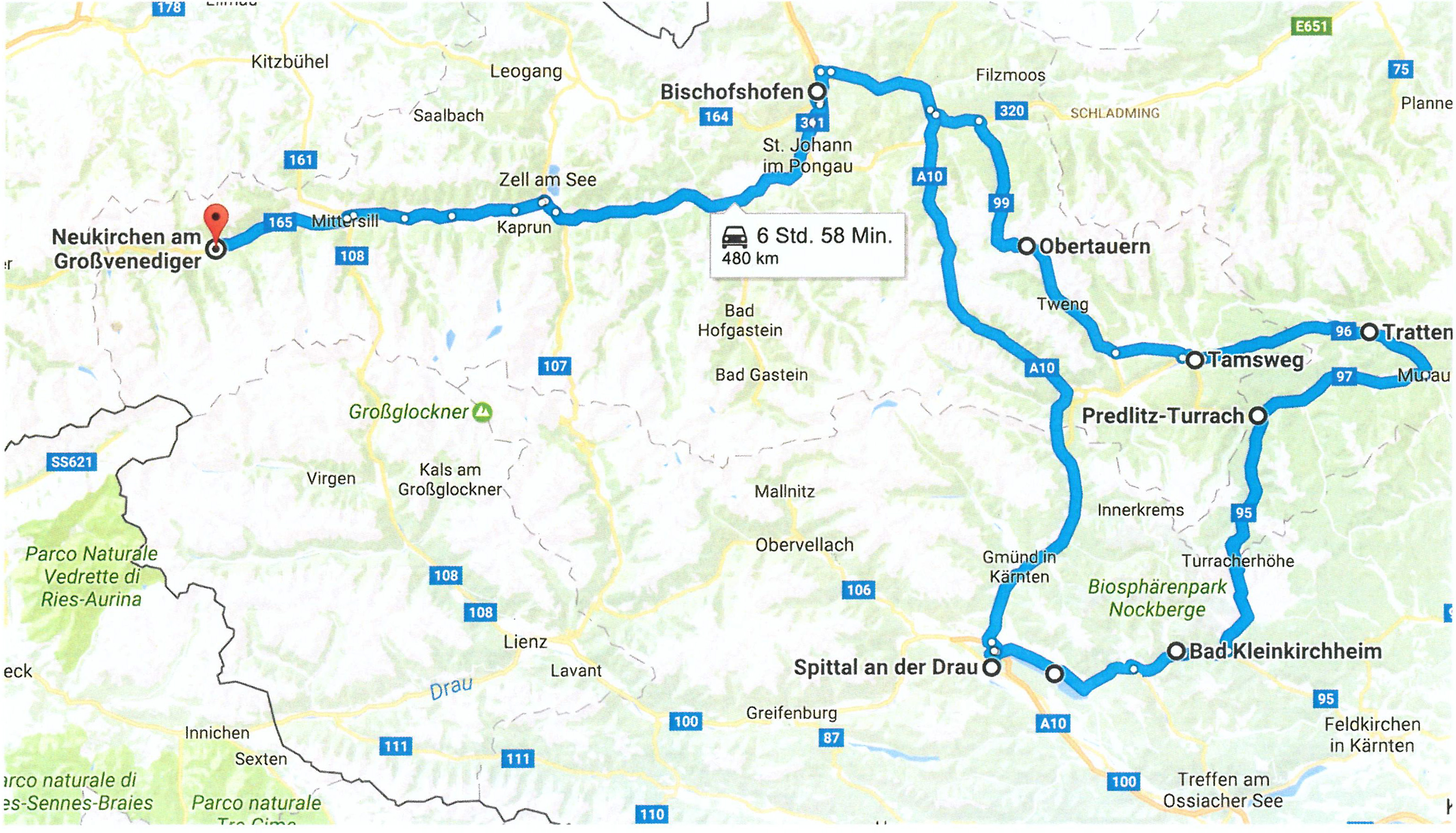 - Neukirchen – Mittersill – Zell am See – Bischofshofen – Obertauern – Tamsweg – Ranten – Murau – Predlitz – Turracher Höhe – Bad Kleinkirchheim – Millstätter See – Spittal a.d. Drau – Gmünd – Katschberg – St. Michael – Obertauern – Bischofshofen – Mittersill – Neukirchen 480 km, Fahrtzeit ca. 7 Std.